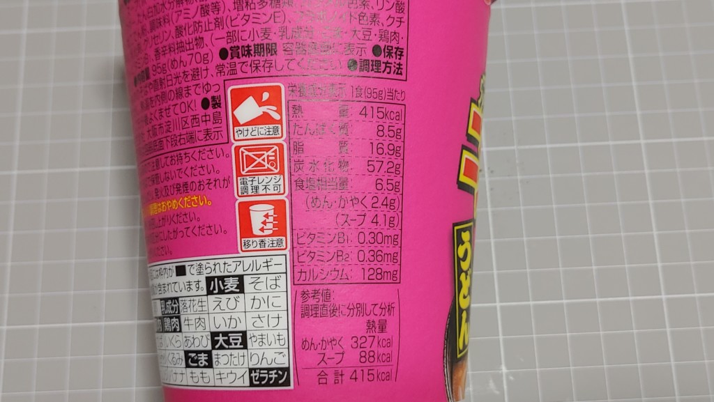 『どん兵衛 ガチニンニク背油風豚骨マシマシ篇うどん』のカロリーは415kcalです。麺とかやくで327kcalでスープが88kcalです。