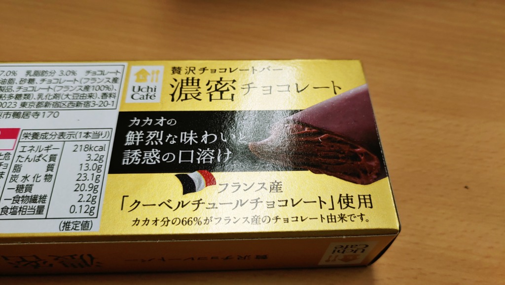 『濃密チョコレート』の原材料はこちらです。『濃密チョコレート』のカロリーは218kcalで脂質は13.0gです。